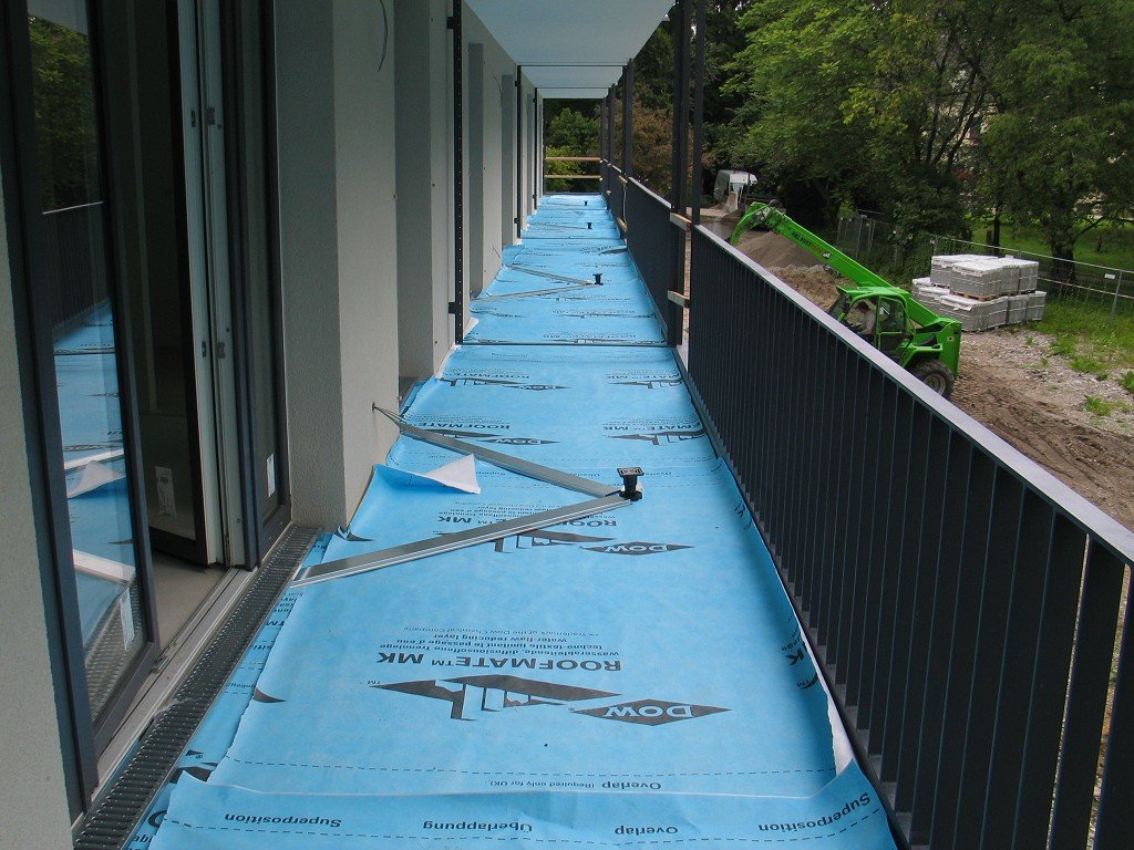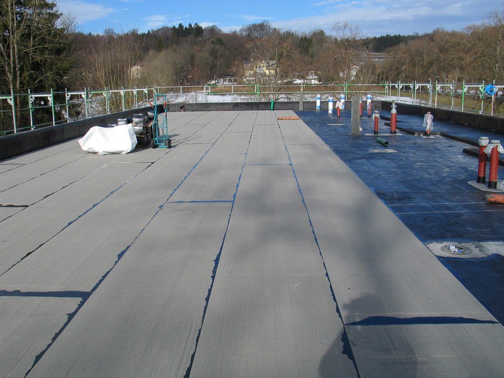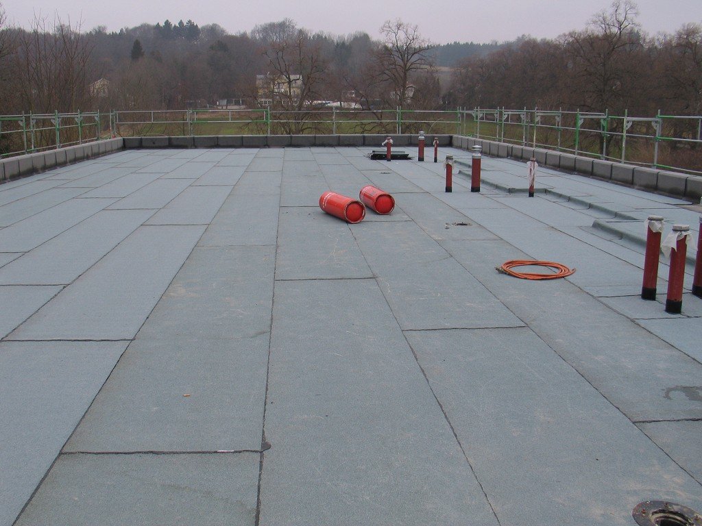 Zu den auszuführenden Arbeiten nach dem Säubern der Dachfläche zählten zunächst das Aufbringen eines Mörtelglattstriches zum Ausgleich der vorhandenen Unebenheiten im Untergrund. Anschließend wurde ein Bitumenvoranstrich als Haftgrund, für die zweilagige Elastomerbitumenabdichtung, bestehend aus 1. Lage Sopralene EKV Talkum/Sand und einer Oberlage aus Sopralene Flam Jardin S5 Schiefer der Fa. Soprema aufgebracht. Darauf wurde eine Umkehrdach-Wärmedämmung der Fa. DOW Roofmate SL-A, 200 mm verlegt. Ein auf der Wärmedämmung aufgebrachtes Filtervlies Roofstat R, dient als Unterlage für die extensive Dachbegrünung der Fa. Optigrün.   Auf unbegrünte Flächen wird eine Kieschüttung mit einer Schichtdicke von ca. 8 cm vorgenommen.