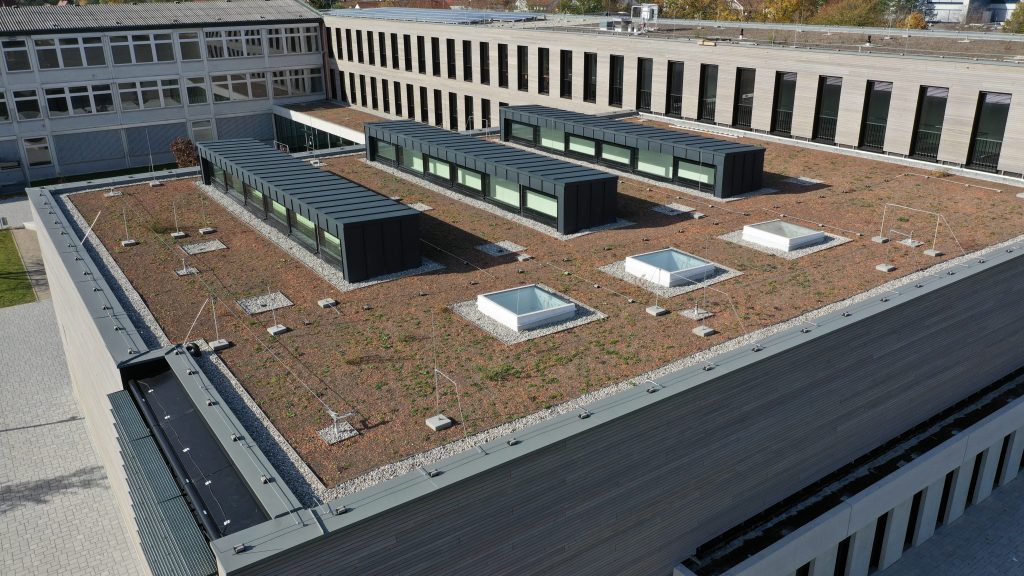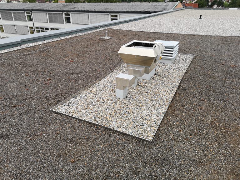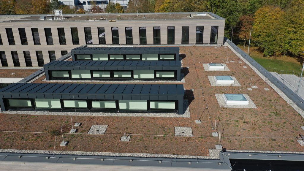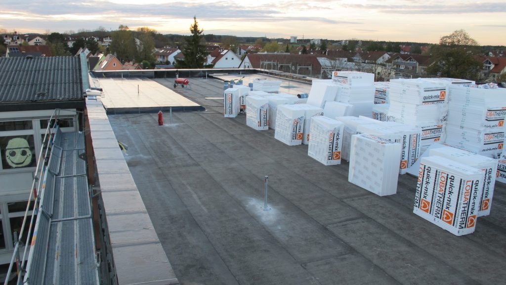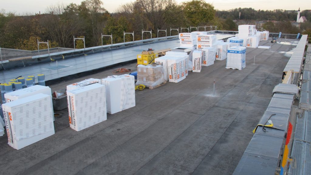 An diesem Bauvorhaben wurde zunächst auf den gereinigten Betonuntergrund ein Bitumen Voranstrich als Haftgrund aufgebracht. Als Dampfsperre wurde eine Soprema Sopravap EVA 35 besandet punkt und streifenweise aufgeschweißt. Darauf wurde eine Gefällewärmedämmung aus EPS mit einer mittleren Dicke von 180 mm in Industriekleber verlegt. Als erste Lage der Dachabdichtung wurde eine Elastomerbitumen-Kaltselbstklebebahn PYE-KTG-KSP-U Sopralene Flam Stick 30 Duo verlegt. Als oberste Lage der Dachabdichtung wurde eine Elastomerbitumen-Schweißbahn Sopralene Flam Jardin S5 wurzel- und rhizomfest, aufgeschweißt. Im Bereich der begrünten Dachflächen wurden ein Schutzvlies sowie eine Dachbegrünung der Fa. Optigrün aufgebracht. In den Dachbereichen unter der PV-Anlage wurde auf die Dachfläche Kies 16/32 aufgebracht. Bei den 3 großen Dachsheds, wurde die komplette Holzunterkonstruktion mit  Konstruktionsvollholz (KVH) hergestellt und mit Mineralfaserdämmung 160 mm ausgedämmt. Die Holzkonstruktion wurde anschließend mit einer Holzwerkstoffplatte Typ OSB/3 innen und aussen vollflächig verkleidet. Des Weiteren kam als äußerer Schutz eine Blechverkleidung in  Doppelstehfalzdeckung mit anthrazit beschichtetem Aluminium Prefa P10 zu Ausführung. Alle anderen Spenglerarbeiten, wie das Anbringen von Schutzblechen und Attikaabdeckungen, wurden in hellgrau beschichtetem Aluminium Prefa P10 erstellt. Weiter wurden Lichtkuppeln mit RWA Steuerung der Fa. Lamilux und die Absturzsicherung der Fa. Innotech verbaut.