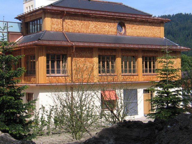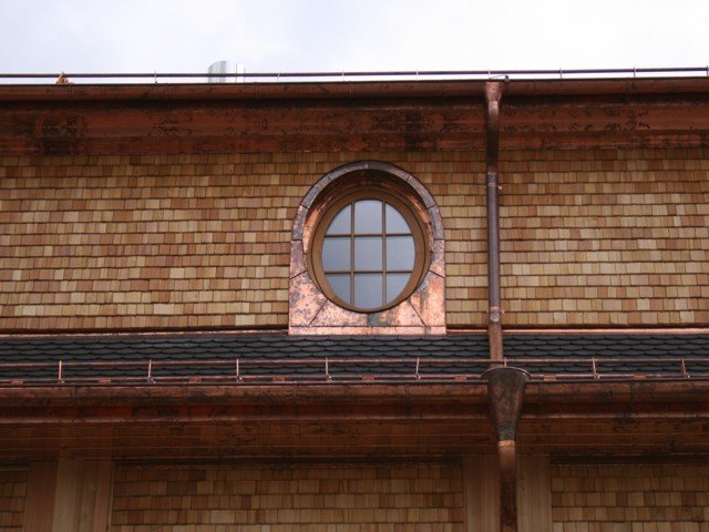 Aufbringen einer Biberschwanzdoppeldeckung mit Unterkonstruktion. Eindeckung sämtlicher Traufen in Doppelstehfalzdeckung. Montage der Unterkonstruktion an Traufgesimse mit Duripanelplatten und Kupferblechverkleidung. Verkleidung der Ovalen Fenster in Kupfer. Gesamte Holzunterkonstruktion mit Dampfsperre, Dämmung und Duripanelplatten an den Fassaden eingebaut. Verkleidung. Anfertigen und montieren sämtlicher Säulen und Füllungen in Lerchenholz. Verkleidung der Außenfassade mit Zedern Holzschindeln. Sämtliche Spenglerarbeiten wurden in Kupfer 0,7 und 1,0 mm ausgeführt.