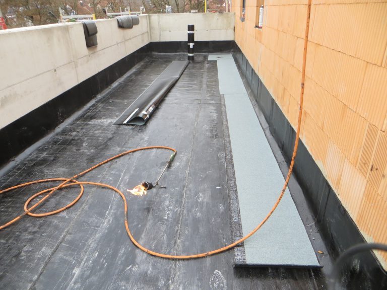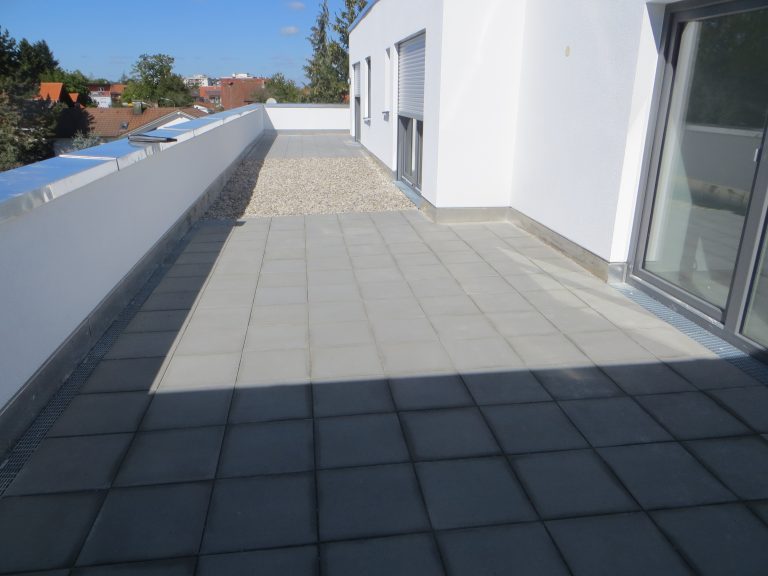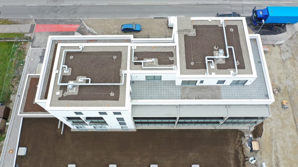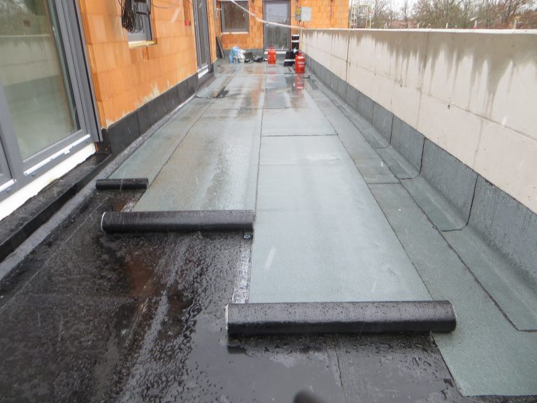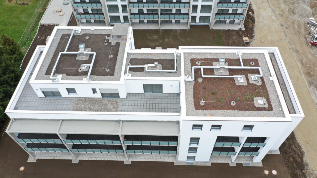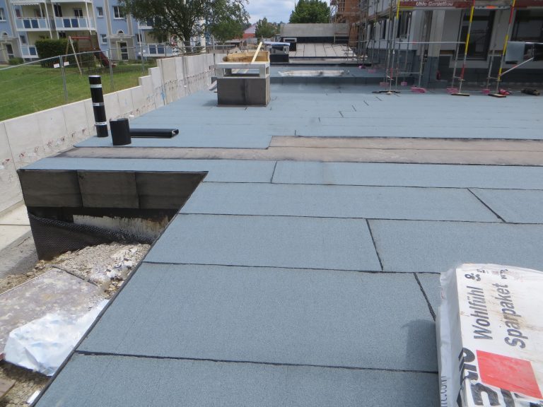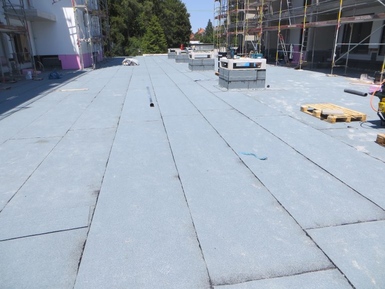 Bei diesem Bauvorhaben wurde die Tiefgaragenabdichtung sowie die Dach- und Balkonabdichtung inkl. der Plattenbeläge und Dachbegrünung ausgeführt. Hierfür wurde zunächst auf den gereinigten Betonuntergrund ein Bitumen Voranstrich als Haftgrund aufgebracht. Als Dampfsperre wurde eine Soprema Sopralene EVA 35 – Sand /Folie vollflächig aufgeschweißt. Darauf wurde eine Gefällewärmedämmung aus EPS mit einer mittleren Dicke von 160 mm in Industriekleber verlegt. Als erste Lage der Dachabdichtung wurde eine Elastomerbitumen-Kaltselbstklebebahn PYE-KTG-KSP-U Sopralene Flam Stick 35 Duo verlegt und im Bereich der Tiefgarage eine Soprema Sopralene EKV – Sand/Sand vollflächig in Heißbitumen 100/25 eingegossen. Als oberste Lage der Dach- und Tiefgaragenabdichtung wurde eine Elastomerbitumen-Schweißbahn Sopralene Flam Jardin S5 wurzel- und rhizomfest, aufgeschweißt. Auf den Dachflächen wurde ein Schutzvlies RMS 900, eine Speichermatte FKD 25, Filtervlies 300 sowie eine Dachbegrünung Typ E-Leicht mit Sedumsprossen der Fa. Optigrün aufgebracht. In Teilbereichen wurde auf der Dachfläche Kies 16/32 aufgebracht. Alle Spenglerarbeiten, wie das Anbringen von Schutzblechen und Attikaabdeckungen, wurden in Aluminium natur 1,0 mm dick erstellt. Als Absturzsicherung wurde das System der Fa. Innotech verbaut.