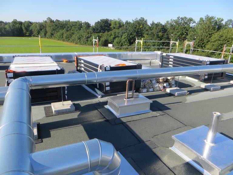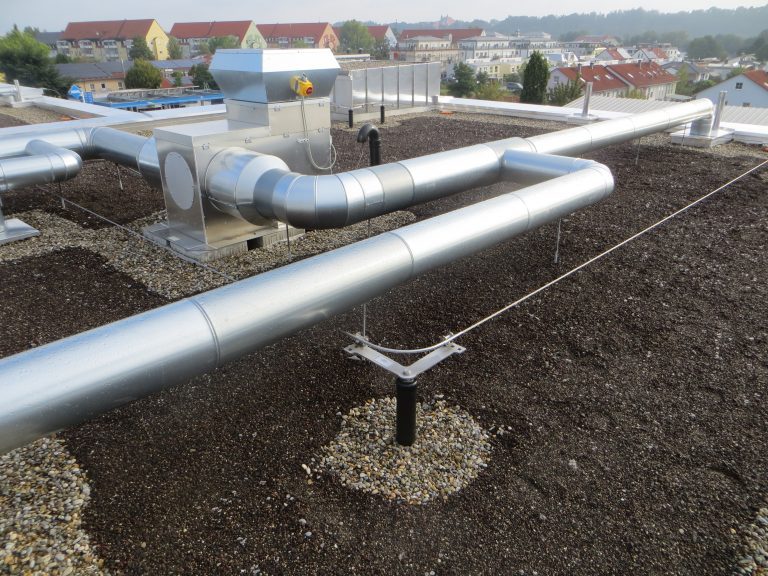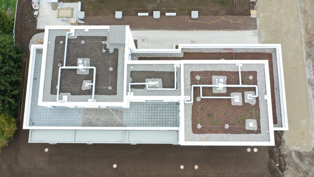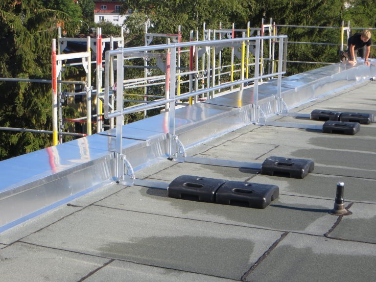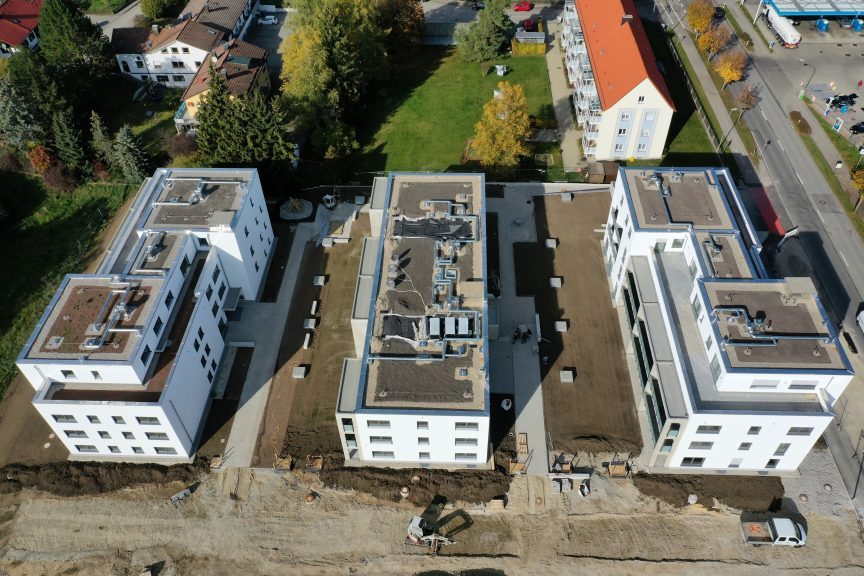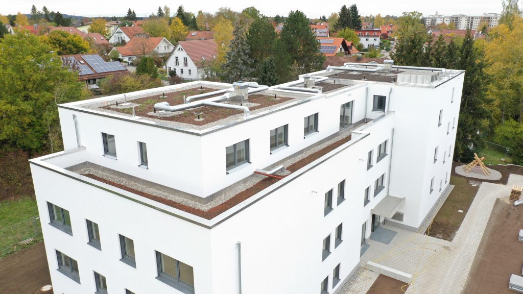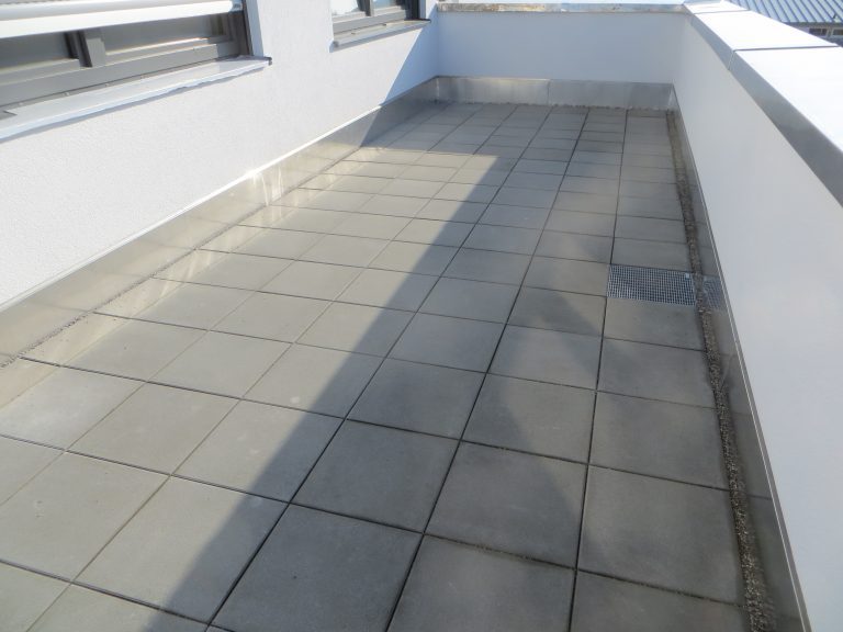 Bei diesem Bauvorhaben wurde die Tiefgaragenabdichtung sowie die Dach- und Balkonabdichtung inkl. der Plattenbeläge und Dachbegrünung ausgeführt. Hierfür wurde zunächst auf den gereinigten Betonuntergrund ein Bitumen Voranstrich als Haftgrund aufgebracht. Als Dampfsperre wurde eine Soprema Sopralene EVA 35 – Sand /Folie vollflächig aufgeschweißt. Darauf wurde eine Gefällewärmedämmung aus EPS mit einer mittleren Dicke von 160 mm in Industriekleber verlegt. Als erste Lage der Dachabdichtung wurde eine Elastomerbitumen-Kaltselbstklebebahn PYE-KTG-KSP-U Sopralene Flam Stick 35 Duo verlegt und im Bereich der Tiefgarage eine Soprema Sopralene EKV – Sand/Sand vollflächig in Heißbitumen 100/25 eingegossen. Als oberste Lage der Dach- und Tiefgaragenabdichtung wurde eine Elastomerbitumen-Schweißbahn Sopralene Flam Jardin S5 wurzel- und rhizomfest, aufgeschweißt. Auf den Dachflächen wurde ein Schutzvlies RMS 900, eine Speichermatte FKD 25, Filtervlies 300 sowie eine Dachbegrünung Typ E-Leicht mit Sedumsprossen der Fa. Optigrün aufgebracht. In Teilbereichen wurde auf der Dachfläche Kies 16/32 aufgebracht. Alle Spenglerarbeiten, wie das Anbringen von Schutzblechen und Attikaabdeckungen, wurden in Aluminium natur 1,0 mm dick erstellt. Als Absturzsicherung wurde das System der Fa. Innotech verbaut.