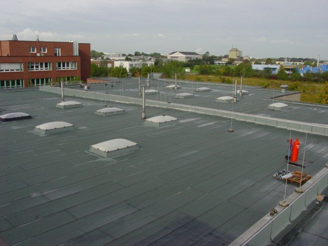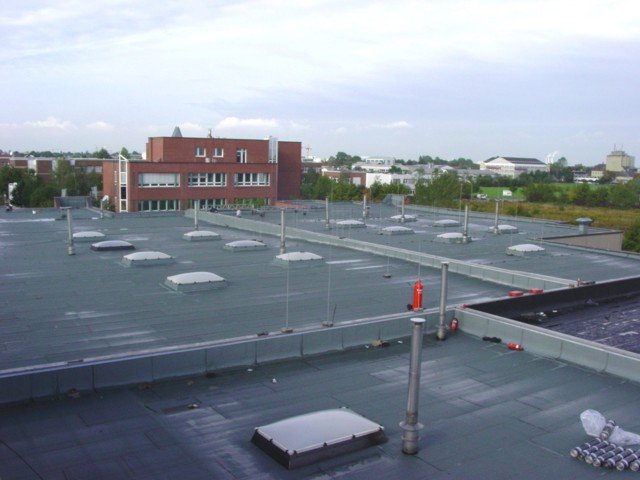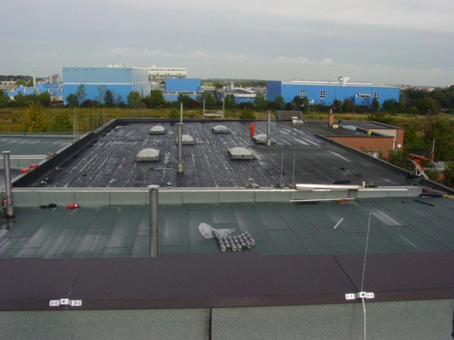 Vollflächig aufschweißen einer Bitumenschweißbahn der Fa. Soprema.
