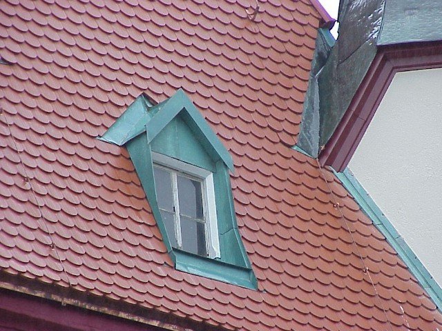 Gauben in Tecu Patina Kupfer 0,7 mm verkleidet, Ziersimse in beschichtetem Blech verkleidet.